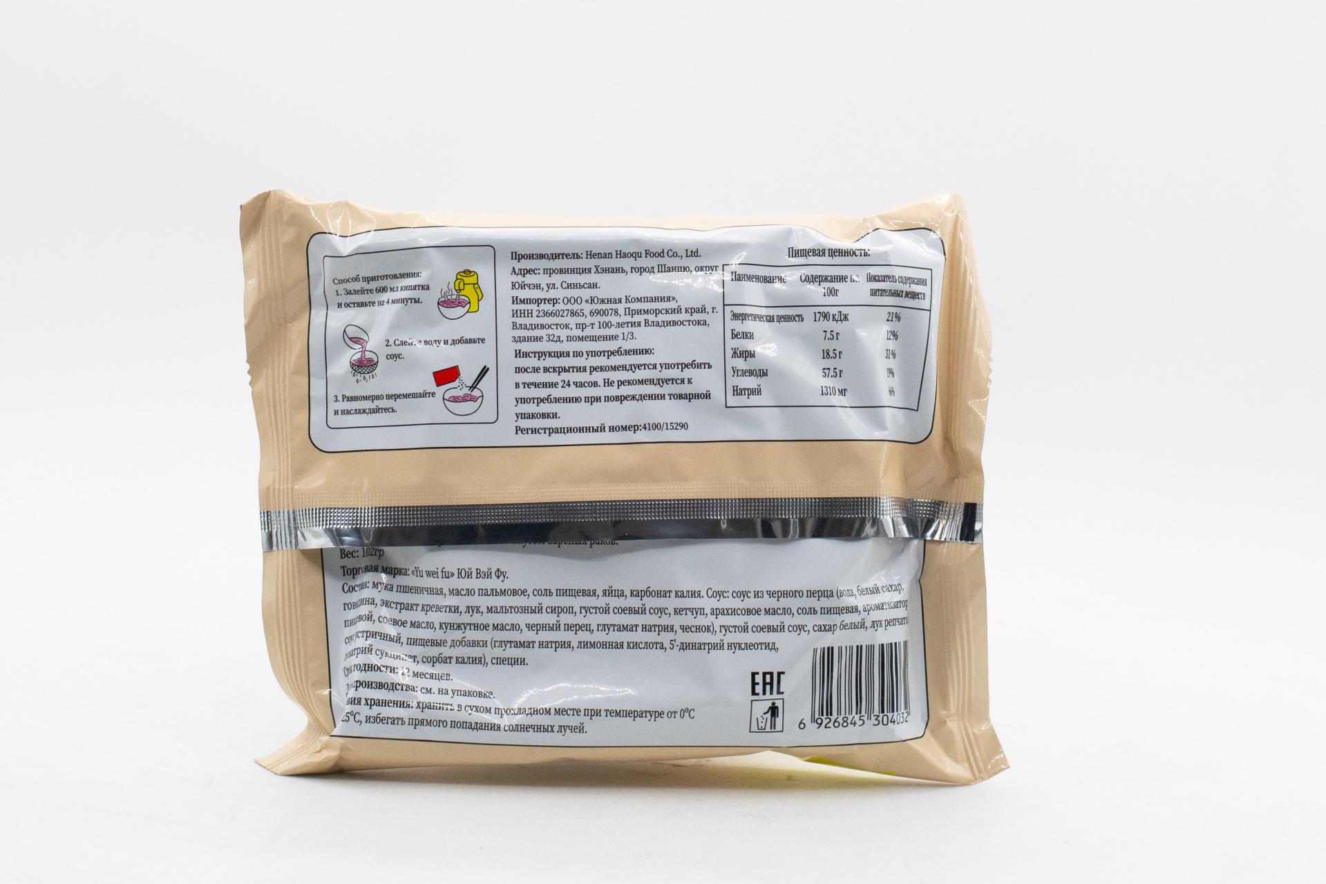 Лапша жареная Юй Вэй Фу со вкусом вареных раков (Китай) 102г0,00 руб. за штуку (в упак. 5 шт.) |
